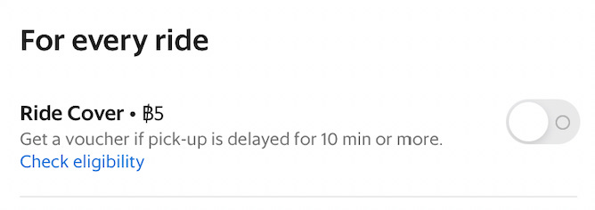 ทุกๆครั้งที่มีการเรียกแกร๊บ เราสามารถเพิ่ม Ride Cover ในราคา 5 บาทต่อทริป เพื่อเพิ่มความคุ้มครองจากอุบัติเหตุ โดยจะคุ้มครองกรณีเสียชีวิต 800,000 บาท และค่ารักษาพยาบาล 100,000 บาท เมื่อเกิดอุบัติเหตุระหว่างการโดยสาร